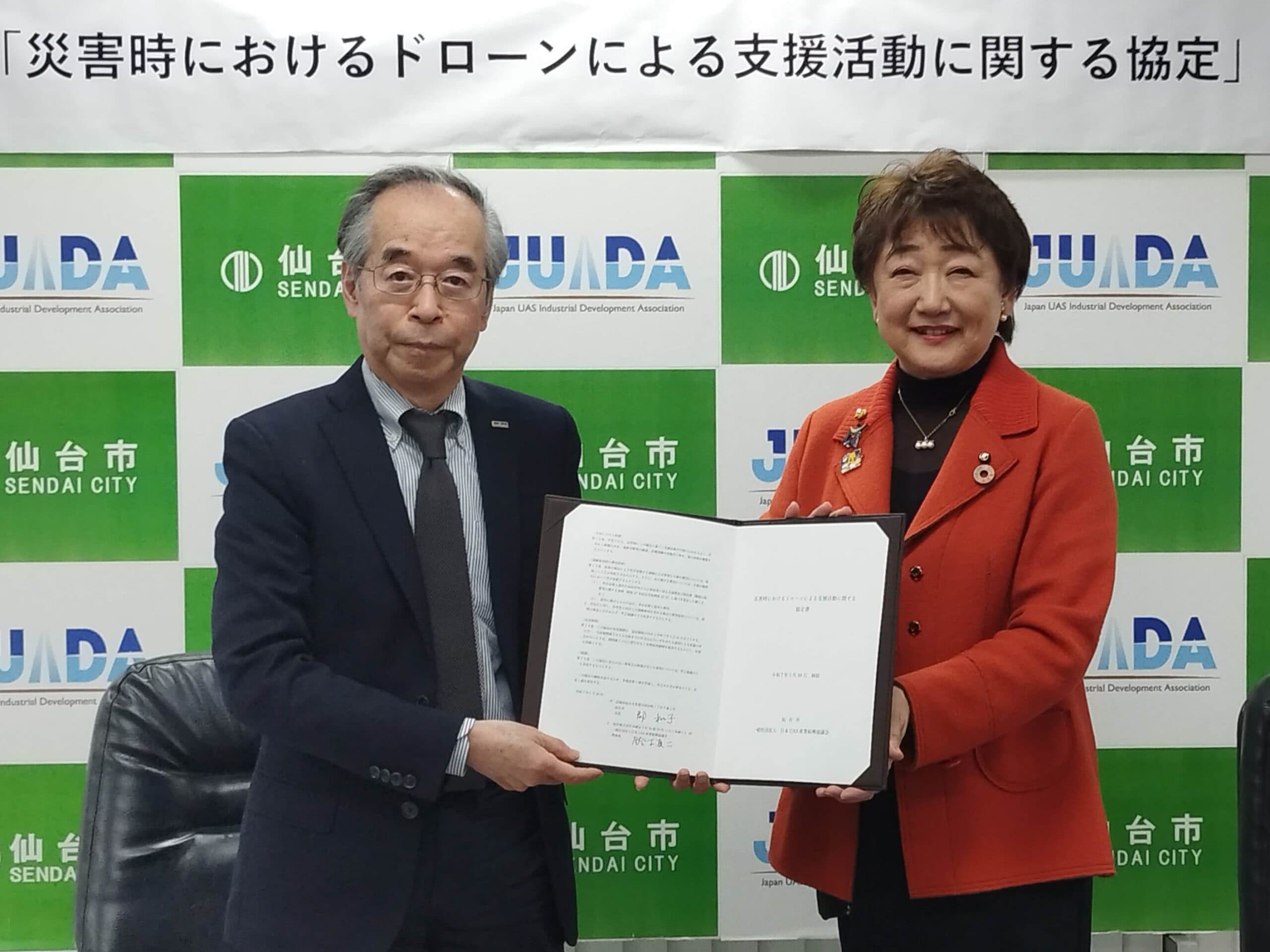 一般社団法人日本UAS産業振興協議会(JUIDA)は、令和7年1月30日 (木)、仙台市と標記の協定を締結いたしました。 市町村とJUIDAとの協定締結は、仙台市が全国で初となります。この協定に基づき、市内において地震、風水害等の災害が発生、又は発生のおそれがある場合、JUIDAは以下の支援活動を実施いたします。