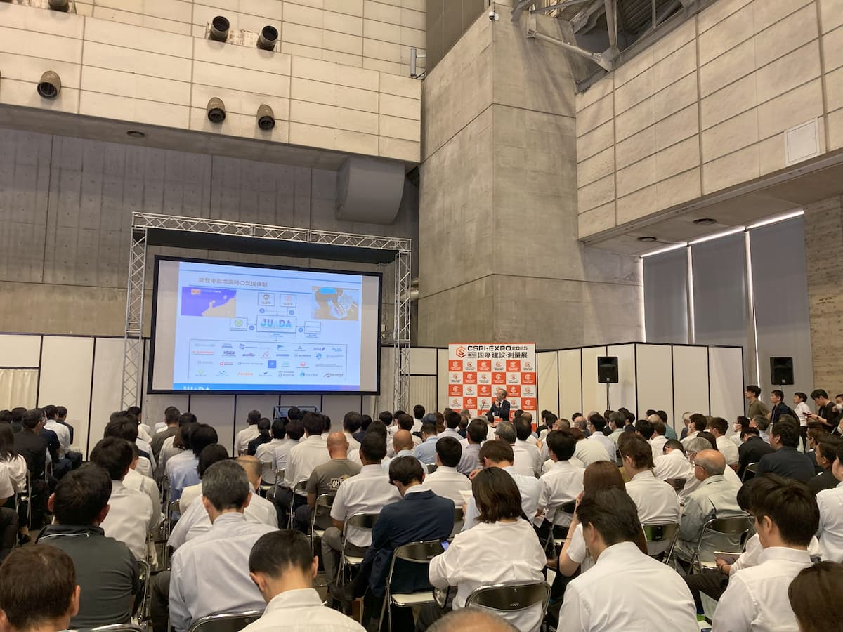 建設・測量業界関係者が集まる、商談・情報収集・課題解決のための展示会、『第7回 国際 建設・測量展(CSPI-EXPO2025)』の初日6月18日(水)、JUIDAの鈴木理事長がオープニングセレモニーのテープカットに参列しました。同日午後は、『建設・測量分野におけるドローンの最前線 最新の適用事例と、飛行安全のため法制度』と題し、複数ドローンの連携飛行でリアルタイム3次元計測を可能とする研究事例や、物資輸送や点検、警備など様々な分野への適用を紹介するとともに、安全な飛行に求められる技術や法制度について、1時間の講演を実施いたしました。