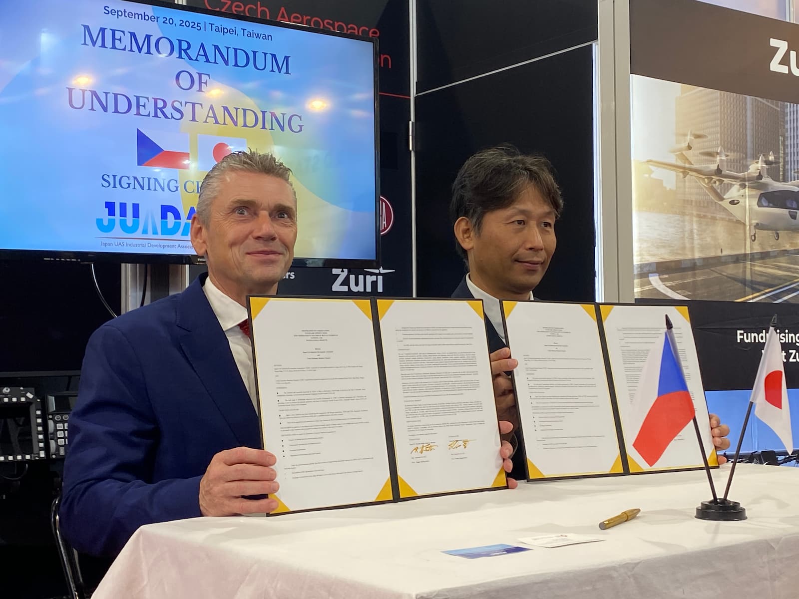 On September 20, 2025, the final day of the Taiwan Aerospace & Defense Technology Exhibition (TADTE 2025) in Taipei, the Japan UAS Industrial Development Association (JUIDA) signed a Memorandum of Understanding (MOU) with the Czech-Taiwanese Business Chamber (CTBC). The signing ceremony took place at CTBC’s exhibition booth, where representatives from Czech aerospace and drone-related companies gathered alongside the Japanese delegation, creating a highly international and collaborative atmosphere.