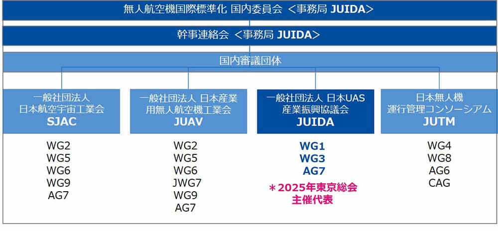 JUIDAは、日本のドローン産業の持続的な発展とグローバル展開のため、国際ルール形成の場で積極的に活動しています。経済産業省国際標準課および日本規格協会の支援を得て、国際標準化機構(ISO)の無人航空機分野技術委員会「ISO/TC 20/SC 16」に参画し、2024年から国内委員会事務局の運営を担っています。