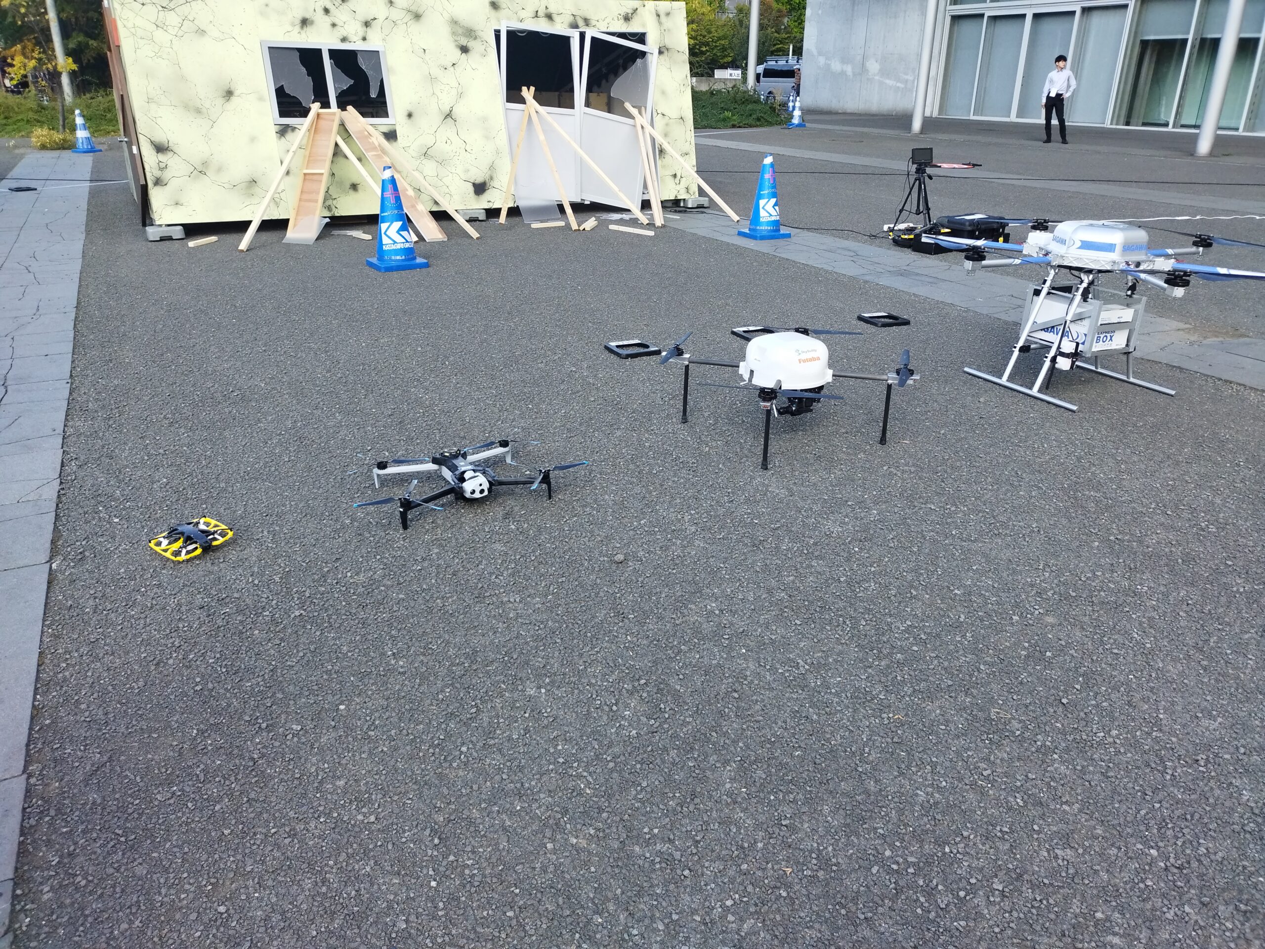 デモフライトのシナリオは、①被災地への前進、②被災地の偵察、③被災場所の特定、④倒壊家屋内部の調査、⑤被災ビルの状況の調査、⑥オルソ画像の分析、⑦孤立地域への薬品輸送の順に実施いたしました。