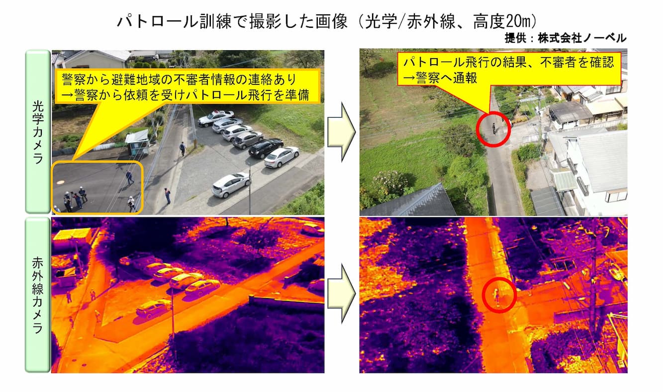 パトロール訓練は、①避難住民が窃盗被害を警察へ通報、②警察がドローン事業者(株式会社ノーベル)へ捜索協力を依頼、③パトロール飛行、④不審者発見後に警察へ連絡の順で実施いたしました。